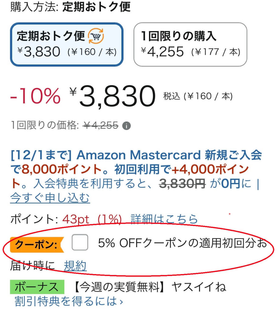 商品ページを見ると「○%OFF」や「〇円OFF」の初回限定のクーポン付きの商品もあります。