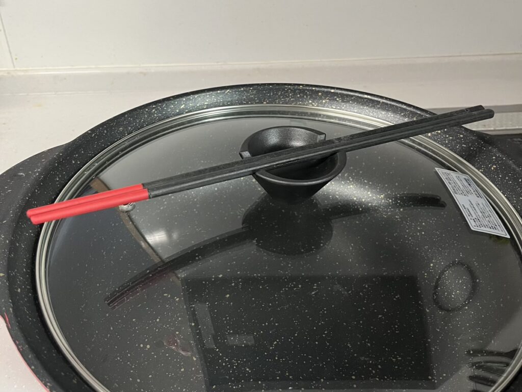本体だけではなく強化ガラスの蓋もセットです。さらに、蓋の持ち手にはくぼみがあり菜箸が置けるようになっています。ちょっとしたことだけど便利。