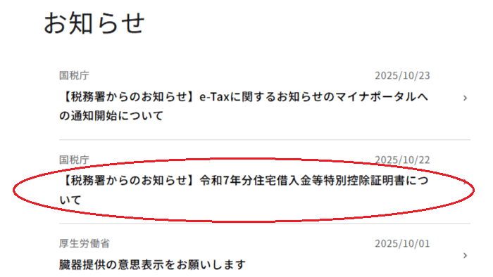 - 「【税務署からのお知らせ】令和〇年分住宅借入金等特別控除証明書について」というお知らせがあるので開く(毎年10月の下旬頃に届きます)
