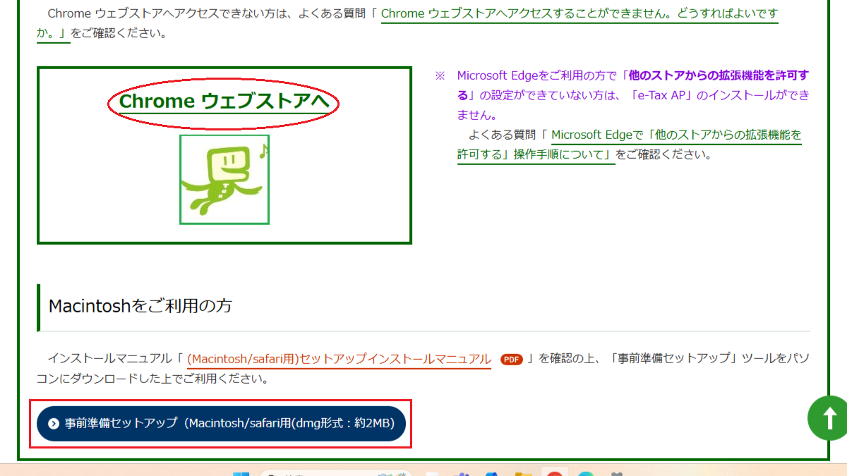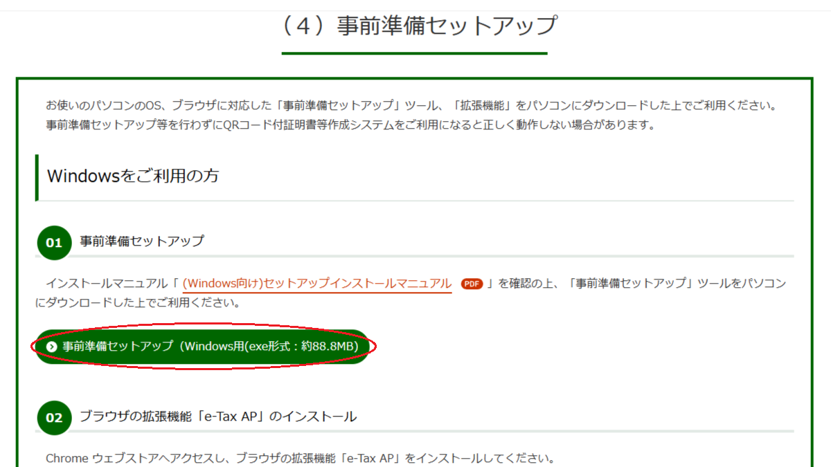 - (4)項目の事前準備セットアップ、ブラウザの拡張機能「e-Tax AP」のインストールを手順に沿って行う(過去にセットアップしている方は不要)