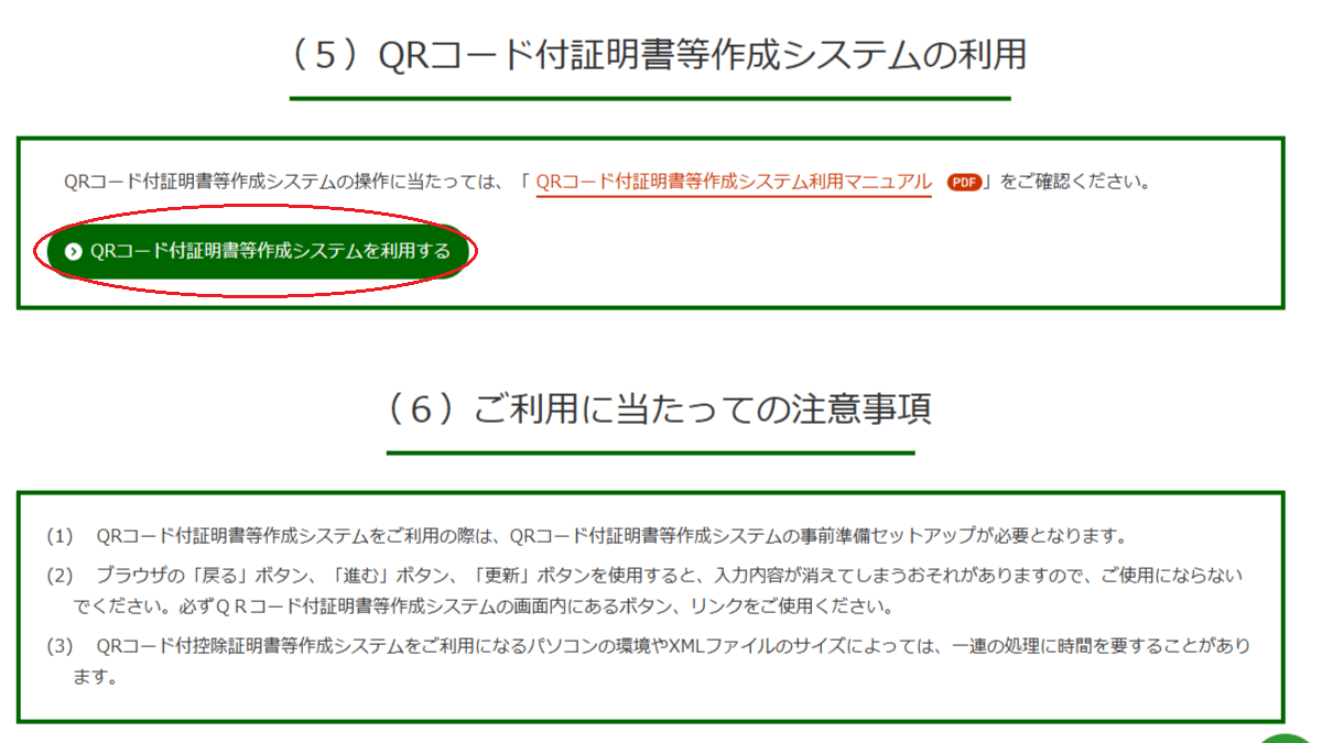 - (5)項目の「QRコード付証明書等作成システムを利用する」をクリックして「次へ」