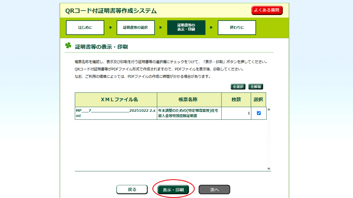 - XMLファイルを「QRコード付証明書等作成システム」を利用しPDFファイルにして印刷する。